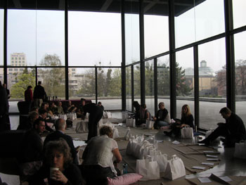 『おはようございます・・』『あっ、おはようございます』 パジャマ姿で、入り口まで行くと、びしっと制服姿の警備員が。『あ、えー・・おはようございます・・』なんか変。 奇妙なプライベート空間と公共の空間が混じりあっている感じだ。 9時に美術館が開館なので、朝はなんと6時から、目ざましコンサートがはじまった。昨日2時に眠ったので、皆、もーろーとしているようだ。 わりと大きな声で、夢をみましたか?とか、目ざまし時計、という歌を歌う横で、係員の人が、枕元に朝刊を配りつつ、声をかけている。 美術館内のベットの上で、珈琲を飲み、新聞を読んでいる人がいる。 |