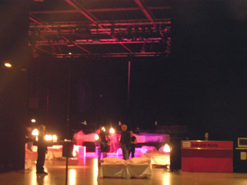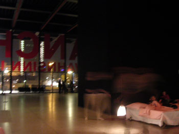 | 真夜中12時、まっしろなドレスを着た歌手のハイケ・シュミットさんと、チェロをかかえた、ティロ・トーマス・クリーガーさんがやってきた。 ベット横にはランプがあり、そのランプの傘部分には、子守唄の楽譜や、眠りに関する詩等が書かれている。 それを読んだり、歌ったりするたび、そのランプの灯をぱちり、と消す。 歌手とチェロ奏者の2人は、ベットとベットの間を走ったり、ベットの側に寝転んだり、合唱したり、踊ったり・・・あ、ね、眠い・・・。 最初は、そっとカメラで写真を撮ったりしていた人たちも、2時頃まで行われたコンサートも最後のランプが消される頃には、みんなぐっすり。 私も、最後のほうはもう記憶がない。最後のランプが消えるまで、見ようと思ったのに・・。とろ〜りと夢に入っていく、ここちよい落ち方だった。 夢を見た。アートな夢ではなかったが、夢の中で、ギャラリーにいた。物音で目をさましガラスばりの四角い建物と、 それをすかして見える、ソニーセンターの姿にあっ、ここ美術館だった・・。と思い出す。 |