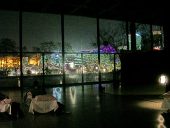 パジャマ姿で、ぺたぺたスリッパを履いて、カタログ売り場を抜け、トイレに行って歯を磨いていると、 なんだか、とってもわくわくしてきて、思わず、こおどり。 むか〜し、デパートに寝泊まりしている女の子の本を読んだ。よく覚えてないのだけれど、 誰もいなくなった静かなショーウィンドーの中で、スケートボードを走らせたり、ふっかふかの布団に寝たり・・・とても憧れた、その気持ちを、急に思い出す。 ぽつぽつと置かれたベットに、皆パジャマでごそごぞ潜り込む。ぺろっと人前でズボンを脱いで、パンツ1枚の人もいる。 アイマスクを準備して来てる人や、シャンペンを飲んでいる人も。 ちょっと隣の人と目配せしたりして、知らない人たちなのに、なんだかちょっと修学旅行のよう。 |