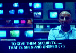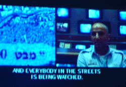 奇妙な暗さ。ひとけが全くない。そこを、カメラが走って行く。これは車のスピードだと彼女は言うが、なんだか見ているうちに、体の中を焦燥感がぞぞぞと走る。頭のてっぺんから、映像に吸い込まれそうになる。走っている映像なのに、なんだか追われているような、追われている自分をまた遠くから傍観しているような奇妙な感覚。ビデオ画面がまるで透明な膜で、その内側と外側に私がいるようだ。 変。吸い込まれる。 そしてもうひとつのビデオ映像。巨大なコントロールルームの映像が横長の画面に2つ写し出される。機械音。 画面が切り替わる。画面の左側にはコントロールルーム、もう一つは監視員のひとりのバストショット。監視員が話す。 『エルサレム市はデリケートな街なんだ。』 『道にいる全ての人達は見られている』 見られている?見張られている? しかし彼はこれは安全のためのコントロールで見守られていると言わんばかりだ。 『これらによって彼等は身の安全を与えられているんだ。』 みえない見張り。みえない視線。 旧市街の映像は、市内のパトロールをする2人乗りの小さな車にたまたま乗せてもらって撮ったのだという。 15年間街を走っているというその陽気なパトロールの2人組のひとりがたまたま飲み物を買いに出て、空いていた席に彼女を座らせてくれ、ハンディカムで映像をゲットしたのだそうだ。 エルサレム旧市街のすべての街角には監視カメラが仕掛けられている。それを、どこかで見ている人がいる。私は知らなかったのだが、旧市街は壁に囲まれ、出入りもコントロールされているそうだ。 『エルサレムは 宗教的にはCity of Light とされているのに、夜になると人が消え、からっぽになる。暗闇になる。人は内に入ってしまう。 その闇を外からみている人がいる。道で目にふれるものは、闇。恐怖。 神はどこにいるの?と感じていた』とMichalは言う。 わたしたちがいる場所と、それをみている視線。その位置関係が、ビデオカメラを通して、入れ代わり、交錯する。 |