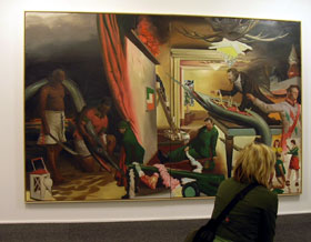 面白いイベントやパフォーマンスなんかがあった方が楽しくはあるんですが・・・。 メッセ自体は、可でも不可もなく。良いなあと思う作品があったり、名前でしか聞いたことの無かった作品を実際見れたり、 全然良いと思えない作品が売れてて、理不尽を感じたり。 でも、1996年から10年、Art Cologne以外の 新しい可能性として14のアートディーラーが集まって考えたアイディアが、大きくなり、ダメになったりもしつつ、 2003年には大手のスポンサーがキャンセルする等の問題も起こり、 それを乗り越えて新生Artforumとして頑張ろうという、 気分がピッとした感じがあり、それに好感を覚えました。 そして、それと比較して、オフメッセは、もっとオフらしさを追求して、 Artforumでは見られないベルリンらしさを出してほしい、と切実に思いました。 せっかく人が沢山来るようになって、“アートのメッカ”としてのベルリンが有名になりつつあるのに、 値段が安いメッセはやっぱり内容も安い、 と思われてしまうようでは残念。オフでしかできないめちゃくちゃパワーの展示とかも見たかったです。 |