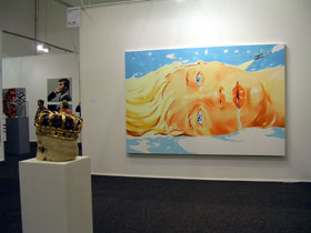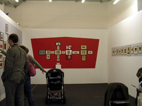 ベルリンのアートメッセ、Artforum は 今年が10周年。 96年、壁崩壊と東西統一を経て、アーティストの街として世界中から注目を受けて居た時に始まったということですね。 2000年に初めて見た時の感想は上記のコンテンツにまとめてあるので書きませんが、最初の頃は多分まだ、 ドイツ最大のメッセである Art Cologneや、 バーゼル等の大きなメッセ (出店料が高いのはもちろんの事、お金を払っても選ばれたギャラリーしか出店できない)とは比べ物にならないということを逆手にとって、 若いベルリンのアーティストを多く出してみたり、パフォーマンスをやったり、色々自由にやっていたと思うのですが、 最近、微妙に落ち着いてしまったような、でも落ち着いて良い程のレベルに達していないと言うか、そんな未消化な印象を受けていました。 あくまでも私個人の感想ですが。そんなメッセも10周年。これからのベルリンのアートシーンはどうなっていくのか?という観点でも興味深いところです。 もちろんベルリンのギャラリーだけが出店してるわけでもベルリンのアーティストだけが出ているだけでもないですが、 世界に向けて『ベルリン・アート』をプレゼンテーションしている場なのですから、やっぱり、その動向は見て取れると思います。 今年は、メッセ会場で行われたアートフォーラム以外にも3つのオフ・メッセが同時開催(9月末日〜10月3日の統一記念日周辺まで。来年は10月頭だそう)。 昨年から始まった、Berliner Liste 、Kunstsalon、そして今年から始まったPreview。 どれも、出店料が安く、オルタナティブスペース等も出店できるとあって、かなりピンからキリまで。 去年のBerliner Listeは面白く無かったけれど、今年は海外からの小さなギャラリーの出店も沢山あるとのことで、色々覗いて、比較してみることにしました。 芸術の秋!アートメッセ三昧の1日です! まずは、今年から始まったPreviewへ。会場は、バックファブリークという、旧工場跡地を改装した所で、 オフィスや、デザイン家具の店なんかが入っています。 ここでは、一度、アジア人アーティストを集めた展覧会が催されたこともあり、この中に展示できるようなスペースは知っていましたが、 35のギャラリーと10のプロジェクトルームが参加する程の広かったかな?他の場所も使うのかな?とちょっと期待して行ってみました。 しかし、スペース自体は1〜2階、+中2階のあまり広く無い場所にぎっしり、といった印象。 |