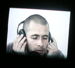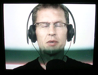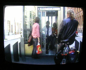 もう2つには、人が写っててその人は、どうやら、この風景のビデオの“音”だけが流れるヘッドホンをしているらしい。 耳をすませて(人は耳をすますと、目を閉じてしまうものらしい。皆目を閉じていた。)どんなことが起こっているかを想像して、 口述している。例えば、上右の映像は、Tucholskystrasse。Sバーンに続くエレベータと、その横はけっこう交通量の多い道である。 私達は、風景の音を聞く事はできず、彼等の口を通して、その“音”を体験するわけなのだが、 例えばカフェの音とか、聞いているだけではカフェ、と簡単に特定できず、不思議な事を色々言っていて、ああ、音だけ聞くとそんな感じなのかな、とか、ちょっとしたズレ、 彼等が考える、音や声から想像されるシーンや、その人の服装とかなんやかや。 私たちがモニタを通して“みて”いることと、かれらが“みよう”としているものの情景のズレみたいなもののところが面白い。 目と耳で私達が掴んでいるモノ、つかんでいる、と思っているものの間にあるモノというか。 シンプルな手法ながら、あれ?ってひきよせられる作品。 このアーティストの作品を色々みてみたいなあと思う、久々のヒット展覧会でした。 |