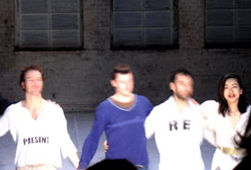 ゴシゴシゴシゴシゴシゴシ。 彼の振動がもう一人のパフォーマーの体につながり、二人は、まるでビデオが、機械の不調で同じところだけをひたすら回ってしまうかのように、ブルブルと動いています。その動きは“今”と“一瞬後”の世界を行き来し、混線して、見ている方も頭が真っ白に。 繰り返される“今”と“過去”、ある時はヒステリックに、ある時は浮遊するように、その合間を行き来する、そんな感じが、みている観客のからだにも伝わってくる作品でした。 |
