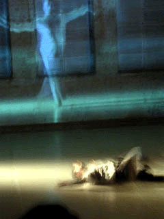 舞台にスポットがあたり、日本人のパフォーマーが再び、にっこりと笑顔を浮かべ、『だるふいっひふぉあしゅてれん、あいねふぉあしゅてるんぐ・・?hぇんでぃーふぉあしゅてるんぐ、にひといーれんふぉあしゅてるんぐにひとえんとしゅぷりひと・・・』 ???ふぉあーしゅてれん、えっ、何? 言語と音の合間のような、意味がゆらゆらと宙をただようように繰り返される言葉。『ふぉあーしゅてれん』は“vorstellen” 紹介する/想像する/思い浮かべる、の意で『ふぉあーしゅてるんぐ』は、“Vorstellung” 紹介/公演/イメージ。『これから公演を御紹介させて頂きます。もしこの公演があなたの想像と一致しなくても・・』という感じの意味です。しかし、意味よりも耳に残る『ふぉあーしゅてれん』が頭の中でぐるぐる。 『ふぉあーしゅてれん』のリピートが終わり、彼女が舞台を後にすると、男の人があらわれ、パフォーマンスを始めます。彼が動くと、それがスクリーン上に再び現れ、彼は過去の彼と共演します(左写真)。そしてそれが終わると再び、『ふぉあーしゅてれん・・』が始まり、再びパフォーマーが彼の画像と踊りだし・・・ スクリーンが微妙に大きく、それを目で追っていると、実際に踊っているパフォーマーが目に入り、彼を追うと、録画画像が迫ってくる・・。画像と彼の動きの微妙なズレで、彼が過去の画像をリードしているのか、追いかけているのかがだんだん分からなくなっていきます。この録画されたブレのある過去の画像/過去をリードし、追う、舞台上に実存するパフォーマー/ひたすらリピートされる『ふぉあーしゅてれん』、この3つの要素が何度も何度も何度も繰り替えされるうちに自分の立っている基軸もよくわからなくなってきます。 |
