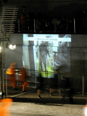 後壁には様々な映像が写し出される。カラオケ画面、ニュース映像・・・・ プラットフォームの周りには、 ベルリン美術大学の学生の 作品が展示されて居た。 これも、ちょっとテーマが不明確で、残念。 |