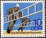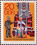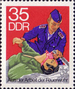 上段の切手は1977年11月発行の“消防隊の仕事”シリーズ。ここでは3種類を紹介していますが、この他に消防車と消防船のモチーフ、合わせて5種類が発行されました。 『生命と市民の健康、社会主義の所有物と個人の所有物、また市民の経済と文化遺産を火災から救う』ことを目的とした消防隊。国の消防隊の他、地区内でも自発的な消防部のようなものがあったそうです。 左から、10Pf “梯子競争”モチーフ。消化のための梯子を持って走るという訓練が消防隊では行われていました。かっこよく火事場に駆け付けていこうという様子かと思ったら、レースの様子だったんですね。ちなみにこのレース、4.4mの梯子を携帯し、32.25m離れた塔の11mの高さにある窓までよじ登るのだそうです。最短では15秒でやりとげた消防士もいるとか。 20Pf “子どもの消防隊訪問”モチーフ。市民にその働きをアピールするために有効だったのが、社会科見学。子ども達は、FDJ(旧東独のボーイスカウトみたいなもの)のスカーフをしていますね。 35 Pf“人工呼吸”モチーフ。消防隊の仕事の“人助け”という部分にスポットをあてたもの。 そして左写真が現在の消防隊モチーフの切手。リアルな写真を使った2002年発行の切手。 |