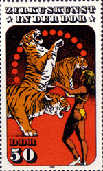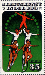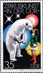 | 次はDDRのサーカスシリーズ。 一番左は1978年発行の市民サーカス25周年記念の切手。 1954年にあった3つの大きなサーカスは1960年に統合し、東独中央サーカスとなります。目標として掲げていたのはソ連のサーカス。サーカスは東独国民の大規模な娯楽のひとつで毎年200万人以上もの来場者があったとか。 ちなみにこれは35Pf“白熊の曲芸”モチーフ。このほか、“馬の曲芸”“象と三輪車”“7人の曲芸師によるピラミッド”のモチーフの計4モチーフの組み印刷。 中央は1985年発行の東独国立サーカス25周年記念切手。 上記のように1960年に統合しひとつの大きなサーカスとなった東独中央サーカスは、1980年に東独国立サーカス、と名前を変えます。 この25年の間にこのサーカスは東独だけでなく世界各国を回り5700万人もの来場を記録。このサーカスは猛獣(ライオンとか?)が5頭、象が2頭、馬が6頭とエキゾチックな曲芸用動物(ヘビとか??)が7匹、30名の曲芸師、ピエログループが4つとオーケストラを2つ抱えていました。これらの曲芸師には国立の専門学校を卒業した人だけがなることができ、世界的にも非常に水準の高いサーカスであるとされていました。 中央は50Pf “トラの曲芸”、右が35Pf “一輪車組み体操”。このほか“空中ブランコのアクロバット”“象の曲芸”の4モチーフ、組み印刷。 そして右写真が2000年発行の“子どものための”ピエロ柄の切手。 |