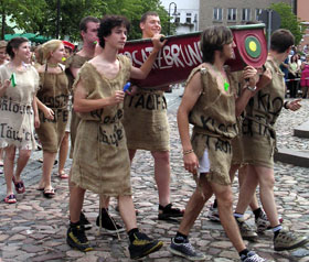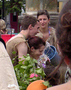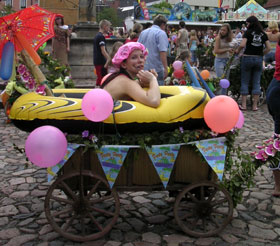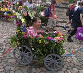 もともとは、1933年、当時6名いた女生徒の1人が始めたもの。 それまで男の卒業生は卒業試験に無事合格すると三名の男子生徒によって胴上げされ、そのまま肩車して郵便局へ向かい、 そこから自宅に『卒業試験ゴウカク。カネオクレ』と電報を打つ風習がありました。(変なの・・) しかし、女生徒にはこの風習はふさわしくない、でも祝いたい、というわけで1人の女生徒が、男子生徒達が肩車で郵便局に向かい、 また出て来るまでの間、手押し車に乗って噴水池に入り、男子が郵便局を後にし、 カフェで大騒ぎをやらかしはじめる時、再び手押し車にのってカフェに乗り付けたのです。 噴水に向かうことから、水をかける、という儀式が第二次世界大戦後始められ、現在のような形になりました。 まずは、洗礼を施す僧、という設定前年度の卒業生達がボートをかついで噴水の周りに集合。 ボロボロの麻袋を裂いて手足を出しただけの貧し気な格好は、僧、の衣装ですが、水をかけたりかけられてびちゃびちゃになるので キレイな服を着て来てもしょうがないから、ということでもあります。 続いて、手押し車に乗った卒業生が学校からガラガラと手押し車に乗ってやってきます。 それぞれ、手押し車を自分達で装飾を施し、他学年の友達や、兄弟姉妹にひいてもらっています。 草や花をたっぷりつけて飾るのが基本的なデコレーションらしく、皆どっさり花を飾っています。 昨日は花屋の花が色々値下げされていましたが、このためだったのか!と納得。 草花で飾ったデコレーションの上に、『やっとオサラバ!』『2005年度卒業』等と書かれた看板を掲げたり、 友達からの寄書きを飾ったり。ビニールプールを乗せて、傘、とか、アラビア人のような格好をした人や、 ステレオとラジカセを持ち込んでテクノをかけている人や・・皆各々趣向をこらしていますが、 ちょっと照れくさく感じているのか、地味に飾り付け、サングラスをかけて斜に構えている人なんかもいました。 うーん、私もここで卒業式を迎えるとしたら、ちょっと同じ心境かもしれない、と思ったり。 しかし、そうかと思うと煙草片手に、シャンペンラッパ飲み、回し飲みをしながら、かなりハイになっている人も。 私の高校は私服だったので、卒業式には仮装をして来てた人もけっこういましたが、 さすがにシャンペンラッパのみとかビール瓶をそこら中に置き散らしている人なんかは居なかったです。 さすがドイツ人の高校生だわ・・。ガタイも良いし、パワーが違います。 |