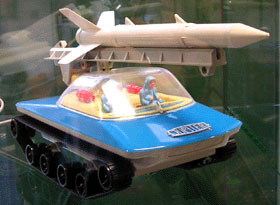 さて、プラスチックや金属製の60年代〜70年代の飛行機や戦車、宇宙船の玩具。ソ連モデルが揃っているのがいかにもです。 同じ社会主義国のソ連と共に宇宙船やロケット開発などに余念がなく、小学生の憧れの職業のベスト5には必ず“宇宙飛行士”がランクインしていたという旧東独。月面探査機やら、宇宙服、ロボット等の玩具は世界的に流行しましたが、もちろん東独でも大ブームでした。ロケットを積んだJUPITERは水色のボディにメタルのロゴが良い感じです。部分的にプラスチックを使ってある様ですが、ここで“プラスチック”といって、日本のプラスチックを想像してはいけません。透明度が低く、独特の乾いた手触りと、すぐポリッと折れる、混ぜ物の多いプラスチックです。素材としては高品質とはお世辞にも言えませんがこの素材を懐かしいと思う東独出身の人も多いみたいです。 プラスチックだけでなく、厚紙と銀紙で作る飛行機モデルもありました。 ドイツ初の光線タービン飛行機のモデルだそうです。 しかしこの組み立て飛行機、難しそう!私も一度テレビ塔の紙組み立てキットを作ったことがありますが、球体部分はこまかく山折リ谷折リをして、球を作らねばならず、柱の部分は円柱なので丸をきれいに切り抜く作業が大変でした。ちょっとでも切り抜き間違えるとはまらなくなったり、ラインが繋がらなくなったりするんです。 余談ですが、昨年くらいからベルリンではこういった紙を切り抜いて作る組み立てキットが流行っていました。ブームに火を付けたのは旧東独独自の建築、プラッテンバウ、旧東独国会議事堂等を作れるファルトプラッテ。ベルリン在の建築家が日々介そうされる東独の歴史を生き延びさせようと制作したもので、この元ネタとなった建築用の図面と組み立てキットはこの“旧東独の玩具展”にも展示されていました!その他、ベルリンの典型的な風景、インビス(屋台の食べ物/飲み屋)に集まる人たち(“年金暮らしのエルンストはここに来てサッカーの話ばかり”等の説明がついている)を組み立てるキットも出ていました。ドイツ人は手先が器用?それともなんでも自分で作るのが好きなだけなのでしょうか。 |