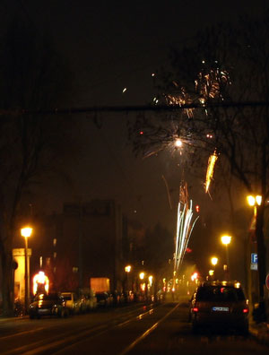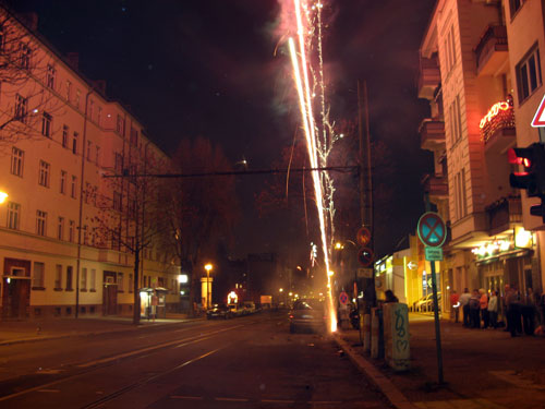 さて、ひとくちに花火といっても、日本にあるような、趣向を凝らした様々な色合い、火花の花火があるわけではありません。白い、シンプルな線香花火にも似た光が数秒続く、Wunderkerzenと呼ばれるもの、ロケット花火、そして爆竹がメインの3つです。ロケット花火は“人に向けてはいけません”と日本ではきつく言い渡されていたと思うのですが、こちらでは、そこら中からロケットが飛んで来ておちおち歩いてもいられないくらいです。