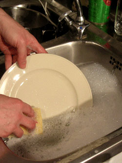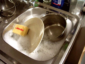 ![]() 洗剤水からひきあげ、かるくこする。 スポンジには洗剤はつけないのがコツ |