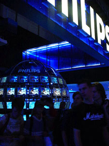 | 日本企業はこういったこういったデジタル系の話題になると注目のマト。首相もHONDAのロボットをチェコに持って行ったりとアピールしているようですが。今回もニュースをつければ毎朝、これがIfa で見られる日本の新しい技術!とSANYOのデジカメのシャッタースピードの早さ、SONYのサイバーショットの小ささを報道しています。 上写真は今回のIfa のSONYブース。メッセ会場では一般客のためにアイドルのコンサートや、花火大会、TVの視聴者参加番組、“スター誕生”、みたいなタレント・オーディション(今ドイツで流行っている)等が開かれていて、16〜18くらいの若い子達が沢山連れ立って来ていました。そんな彼等をひきつけて放さないのがこのSONYブースなのです。 メッセ会場は20数個の大ホールに分けれられているのですが、SONYはビッグサイトの2分の1くらいの大きさだというブースを丸々1つ使い、アイトーイやプレイステーションの新ソフト、車に実際乗って楽しむゲームなどとにかく、インタラクティブな、体を使って楽しめるコーナーをちりばめ、その中にちゃんとデジカメやビデオの新製品コーナー、バイオのメンテナンスコーナーを作る等して大人のお客も押さえ・・・とどこのコーナーより圧倒的な年齢層の幅広さと集客率の良さを見せつけていました。 私はビデオとカメラを中心に色々見たのですが、しかし小さい!そして高機能! レンズがクリッと回って自分が写せるなど、痒い所に手が届くような発想で作られていますね..日本の製品は。さすがです。 |