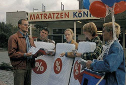 職業安定所に行って『ドイツ語話せる人!』と捕まえてきた人達にマットレスを着せ、ニューオープンのチラシを配らせるのですが・・・。 |