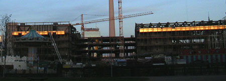 *追記 9/29、国務文化大臣クリスティーナ・ヴァイスは、あくまでも、2005年夏の取り壊し計画に反対しているわけではない、としながらも 『新計画がはっきりしない間は、取り壊しも無し!』と発表した。 すぐにコンペが打ち出せる程の財力は現在のベルリン市には無いので、2005年の夏、すぐに取り壊しにかかれる可能性は薄くなったとも考えられる。 しかし大臣はまた、これまでの共和国宮殿内で行われたプログラムは成功をおさめたが、 どのプログラムも、あえてこの共和国宮殿内で開催される意義は認められない、とし、『この歴史に汚染された場所を使用する、という真面目な議論の欠如』を指摘している。(2004年9月追記) *追記その2 上の写真は、2006年クリスマスの様子。パラスト・デア・レパブリックが骨組みだけになってしまい、 向こう側のテレビ塔などが透けて見えるのがわかるかと思います。 この骨組みを生かして、ホワイトキューブ的なコンテンポラリーアートを展示する空間を作る、という計画などが発表されていたにも関わらず、 取り壊しが始められてしまいました。 そして、この跡地を何にするか、という計画については、色々な提案がありますが、まずは更地になったところで、 資金繰りを考えつつ、実行されるでしょう。 宮殿を再建したいという計画については、資金が十分に集まらなかったようです。ほっ(2007年3月追記) |