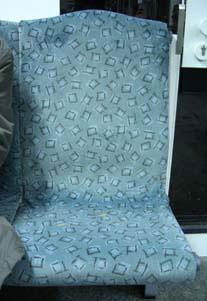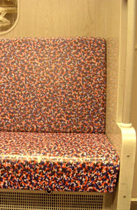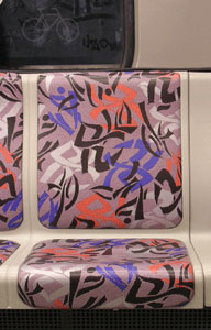 車内は木目調の壁紙が貼られていたりします。それからRing Bahn(環状線)のシート(中写真)。これは迷彩というか、紫グレーの地にリボン状の赤、黒、青、白色が。この線は落書きが多い線ですが、このシートの上では、黒いスプレーも、銀色のスプレーも、まったく目立ちません。そういう意味では成功しているデザインと言えるかも。車内には、上写真のようなベルリン名所の柄が施されています。 そして、市電やU8線で最近よくみかける、段差がなく車両の仕切りも無い、新デザインの車両で使われているグレートーンのモザイクの地に黄色、水色、赤の水玉が散っている柄(右写真)。これは、他の2種がビニール素材なのに対し、フェルトのような毛羽立った布で、汚れやすそうですが、色がもともと発色がよくないので、すり減ってもあまり気になりません。とにかく、素敵なデザイン、というよりは、できる限り長く使用でき、かつ汚れが気にならないので清掃の必要もあまりない、実用的であることがこれらのデザインにおいて重要視されているのではないでしょうか。 |