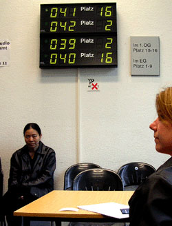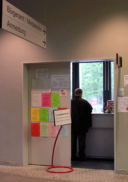 書類と一緒に番号をもらいます。これが順番待ちの番号なので、なくさないように。早朝に来たにも関わらず、現在の番号が30番代で、 私の番号は60番だったので、二時間待ちを覚悟したのですが、なんと30分で順番が来たのでちょっとびっくり!以前は、受付窓口が少なく、雑誌を読みながら待っている人たちの姿が憂鬱でしたが・・。 ドイツ人の中には、書類をもらえる時にもらっておいて、家で書類を作成、番号だけ当日にもらい、後は1時間くらいどこかにお茶を飲みにいってしまう、という人も居ます。 これはなかなか、順番待ちのストレスもないので賢いやり方。 私は本を持ってきたので、読みながら時間を待ちました。待っている人の顔は、様々。中国人、インド人、ベトナム人、フランス人、アラブ人・・・ 様々な言葉が部屋の中を飛び交い、辞書を片手に書類を書いている人も。 ここで住民登録をすれば、立派にベルリン人。明日からベルリンでの生活が始まります! *追記 その後うっかり、住民登録票を無くしてしまいました。この紙、ビザ更新の時やら、新居探しやら、後は銀行に口座を作る時など何かと必要となるんですね。というわけで2007年3月、再取得を頼みにいったら、以前はぺらぺらのカーボン紙に適当にサインされたものだったのが、ちゃんとプリントされたA4の紙になっていました。今年から変わったそうです。再発行には数ユーロかかりました。 |