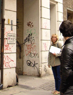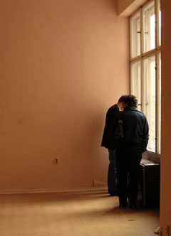 ![]() 部屋をチェック。 この部屋は120平米もあって 300ユーロと格安だが、 電気の配線等、大幅の改装が必要。 さらに、暖房機が小さい上 不動産屋も使い方が分らない 謎の東独プロダクトで、 見学者は頭をひねっていた。 自分で直せるの、これ? 安いけど、改装費がかかるよ〜! とこっそり相談中 |