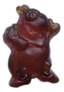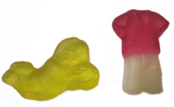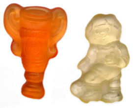 | サッカーグミは、ワールドカップ開催に合わせて販売されたもので、各社のこだわりはサッカーグミ、の項で分析しました。 左ここでもハリボーはそのデザイン性の高さ、こだわりで他社を圧倒していたんですが、 このサッカーミックス(バラ売り用)は大きめなので、さらにすごいです。 食べごたえのある大きめのハリボー君、2ポーズ。優勝カップ、ユニフォームの4種類のほか、サッカーボールなどもありました。 なんといっても注目していただきたいのは、ハリボー君です。 ポーズを取っているのですが、ポーズだけに重点が置かれておらず、コスチュームの細部まで手がかけられているんです。 ふつうの選手は、エリ付きの半袖、半ズボンのユニフォーム。 靴下は膝のところで折り返しています。 ゴールキーパー姿のハリボー君は、長袖に、細身の長ズボンというユニフォーム。 手には分厚いキーパーグローブ。そして、よ〜く膝のところを見てください。 キーパー用のサポーター、ひざ当てを装着しているんです! す、すごいです・・。 こんな豆粒大のディティールにまでこだわる、ハリボー社の心意気を感じる逸品。 |