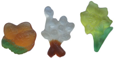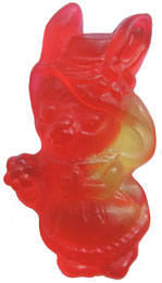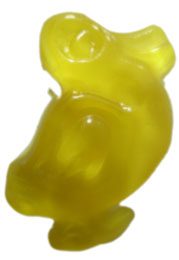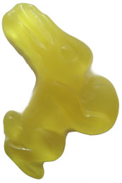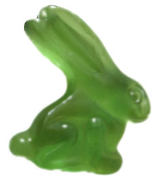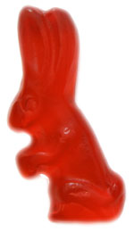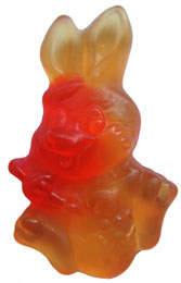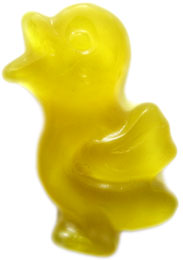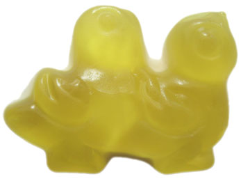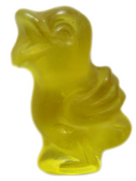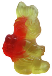 | しかしこの『Trolli』社『Osternest』のグミ。『HARIBO』の『Osterkorb』とだけ比較した場合、かなり頑張っている感じが見えてきます。 上段のものが『Trolli』のもの。グミ本体が柔らかいため、全体的にアウトラインがくっきり出ていない感はあるものの、左端のヒヨコなど、本家『HARIBO』にかなり迫っているのではないでしょうか!! 下段の『HARIBO』のヒヨコのほうが、くちばしが立体的で3枚ある羽根がくっきりしていて、お尻のところにもちょっと毛羽だちがあるなど、細部が表現されています。 しかし、この似方は尋常ではありません。微妙に大きさが違わなければ、同じ型を使ったのでは?と思ってしまう程。グミにコピーライトがあったら確実にひっかかっているでしょう。 惜しむらくは羽根。『Trolli』のほうは、ぬらっとしてて、羽根というより水かきっぽい仕上がりです。 うさぎについては『Trolli』に軍配があがりました。『HARIBO』の方は動きが固く置物っぽいのですが、『Trolli』の方はちょっと擬人化した動きで、卵を持って飛び回りそうです。 ただ、何度も言うようにグミが柔らか過ぎで、一袋の中で1つくらいしか、形がはっきり出ている物がありませんでした。 後は、2つのグミがくっついてしまっていたり、部分的にとろけていたり・・。毒々しい緑色などが裏面のマシュマロに溶けて、あまり美味しそうではありませんでした・・。 小さめのヒヨコが2羽くっついた『Trolli』オリジナル?型も、発想はすごくかわいい! もっと形がはっきりしていれば、紐でつなげて、首飾りか、ウィンドー飾りにでも出来そうなのに、ぬらっとしているので、可愛さ半減。むくむくしたペリカンはなかなか可愛いです。 |