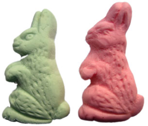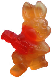 | でも、ここで終わらないのが『HARIBO』の底力。 ファンを裏切らない、妙なデザインもあるのが嬉しいです。『Osterspass』と名付けられた、300gお徳用パック。これには、ハリボ・デザインの粋がぎゅぎゅっと集められていました。 まずは、アニメっぽいうさぎ4種。右から、卵が入った籠を背負った半ズボンのウサギ、ファンシーな女の子ウサギ、卵に色を塗るウサギ、ギター・ウサギ。 1つ1つ、凝りに凝っています。まず、ウサギ本体が『Osterkorb』とはまったく違う感覚で仕上げられています。 アニメキャラのような、くりくり目玉に丸いほっぺた、小さく微妙に尖った鼻。足も3つ指がどれもぷくっとしています。 小物のディティールの細かさに涙が出そうです。どうせ口に入って、胃袋で消化されてしまうだけの物だと言うのに、なぜ、ここまで気合いが入っているのでしょう! 左端のウサギが背負っている籠は、編み目の立体感(両端が次の端の下に入り込んでいる感じ)まで表現されています。半ズボンはコーデュロイ素材でしょうか、ちょっと山男風です。 個人的になかなか気に入ったのが女の子。懐かしのハウスアニメ劇場を思い出すファンシーなドレス。 裾レースだけでなく、よくよく見ると、首周りにもひらひらしたレースの襟がついているのがわかります。 ボンネット帽には葉付きのバラの花がさされ、手にも花。襟、スカート、で皺の立体具合を変えてあるので、素材が違う感じがするのもすごい。 一見ふつうな卵に絵を描いているうさぎも、絵が微妙に立体的になっていて、筆の穂先に毛の筋が入っていたり、ギター・ウサギのギターの弦が微妙にあったりするのも泣かせます。 そして、そのウサギたちに混じって、『食べる芸術品』とでも言えそうな、ブローチにでもしたくなりそうな、花束や籠入りのイースタエッグが入っています。 イースターエッグは、籠の立体感と、2次元の中で、卵の立体感を表す、表面加工がすごいです。 そして、マシュマロのような食感の『怖・古めかしいウサギ』も。教会とかでみかける古い絵画や彫刻のような、奇妙にリアルさがあるため逆にコミカルに見える、あの感じ。 目玉と、毛並みを表現しているのであろう、ぶつぶつが怖い。 砂糖の塊のような、味の無い卵型の物体(グミでもマシュマロでもなく、砂糖をカラーコーティングしただけの不思議な食べ物)と、 つぶつぶ砂糖をまぶしたゼリーと、もう1つ、タッチの違うウサギのグミ(裏面にマシュマロ付き)が入った、かなりお得なセットでした。さすが、普通の袋より多めの300g! 今年のイースターグミの中で、高得点をマークした物の1つです。 プレゼントにぴったりのミニミニセットや、マシュマロ付きのグミ、苦手な、砂糖付きゼリー・・まだまだ『HARIBO』のイースターは終わりません! イースターその2に続きます。 |