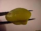 | 左はLOTTE のドラえもんグミ、右はHARIBOの熊のグミです。ドラえもんグミの方がやや大きいようです2つをそれぞれ、ピンセットで力一杯つまんでみました。その結果が下写真です。ドラえもんグミの方がピンセットにめりこむように柔らかい感触でした。ドラえもんは見る影もありません。一方、HARIBOのグミの方はつまもうとすると、弾力がありすぎて飛び出してしまいます。押さえ付けつつなんとか写真を取りました。これが熊に見えるかどうかはともかくとして、形がほぼ保たれています。 色々なグミを試食し、ドイツのグミは一般的に日本のグミより歯ごたえがある、という結論がでました。これは、日本人の食嗜好が、ドイツ人より“柔らかい”傾向というのも関係するでしょうし、ドイツ人の方が日本人よりアゴが強く、歯並びが肉食動物のそれ、噛み切る力が優れているということにも関係するかもしれません。(これはドイツの歯医者さんで耳にした話) しかし、ドイツにも例えば、Katjes のヨーグルトグミのような柔らかいグミというのは存在します。(右写真)しかし、この“柔らかい”、は日本のモノとはまったく異なる食感、弾力の無い感じで、ドラえもんグミに見られるような柔らかい中にも、形を再び保つ弾力がある、というのとは違うのです。外側は固めなのですが、中は柔らかく、指で押すと割れてしまいます。ちなみにこのグミはゼラチンは全く含まれておらず、代わりに、ジャム等を固めるのに使う、ペクチンのみが使われています。上写真のドラえもんグミもゼラチンの他にペクチンが少々含まれているようですが、HARIBOのグミにはゼラチンとミツロウが含まれています。 | |||
