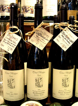 この小さな店は、なんと1976年開業。当時、西ベルリンはドイツの中でもワイン後進地区。ワインといったら赤、白、ロゼの甘口の3種類のみ、もっぱらビールしかなかったベルリンに辛口ワインを入れたのはこの店が始めてで話題になりました。 もともとは当時ベルリンの大学生だった現在のオーナー達に、ラインランド・プファルツという西ドイツの小さなワイン農家の多い地区に友だちが多く、旅行の際等にワインを沢山買い込み、ベルリンに帰ってきてから学生のパーティ等で持っていったのが始まり。クオリティの高いワインを安く、楽しめるように!というのが最初のアイディアで、学生相手の商売だったため、最初のワインは1本平均1、80マルク(150円くらい!)という安さだったとか。さすがにここまで安くないですが、安いのは今でも変わらず。 小さな農家と専属契約をして手に入れていると言う希少なワインをどうしてこんな値段で提供できるの?と聞いてみた所、『この店で働いている人達はだれもこのワインショップで生計を立てていないからね。』とのお答え。他に職のあるワイン好きの4名が集まって、ほとんど趣味でやっているこのお店、彼等は好きなワインだけを仕入れ、売っているのです。 他の職を持っている彼等の時間に合わせてあるため、開店時間はまちまちで短いですが、ワイン好きなら足を運んでみる価値あり!ワインに詳しい彼等はワインについて語り出すと止まらない。お勧めを聞くと、コレも、コレも、と次々に試飲のグラスがずらり、下戸の私は試飲だけで足元がおぼつかなくなってしまう事も(笑) ちなみに、ドイツワインの中でのお薦めはテオ・ミンゲスというプファルツ地方の農家のモノ。 この農家のどこが良いかと言うと、まず、様々な種類のワインを作っている事(リースリング、アウスレーゼ等)毎年毎年作る度に詳しくワインの味を試し、より良いワインを作ろうと頑張っているところで、毎年工夫を重ね、美味しいワインを出しているといいます。私もよく、ココの白ワインを買いますが、フルーティで飲みやすく、香り高いです。 |