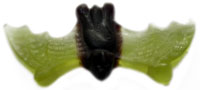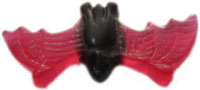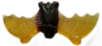 この羽部分、良く見ると表面に毛のような模様がしっかり浮き上がっています。ちゃんと羽を広げる骨の部分もありますし、 羽の先についている鍵型の爪有り、本体部分にも、足にちゃんとツメがついていたり、かなりの凝り様。 もっと近くて観察するべく袋をあけると、ラクリッツ特有の香ばしいような薬のような香が・・ ううっ。 うあーこれがラクリッツ無しで作ってあれば、かなりお気に入りの1つになるのに・・残念です。 パッケージの袋にはHARIBO君とコウモリのイラスト入り、透明な部分を囲うようにプリントされた、3色の小さなコウモリがとっても可愛い! HARIBO君は、最近のヘルシー指向にのっかるように『OHNE FETT(ノン・フェット)』と言っていますが、これが吸血鬼のイメージに全然合っていないのが残念。 最近のグミのパッケージには必ずと言って良い程、この『OHNE FETT』の文字がプリントされていますが、 ゼラチンを使っている物には必ず脂肪分が含まれていると思うんですが・・どうなんでしょう。良く考えてみれば、脂肪が入ってなくても糖分がすごいから、 決してヘルシーではないと思います。あくまでもジャンクな食べ物です、と主張して欲しい気がするんですがねえ。 |