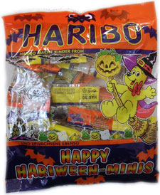 小袋には、カボチャとコウモリプリント、小さなお化けなんかも描かれていて、ちょっとしたプレゼントに良い感じ。 こちらの、新しいホラー・ミックスの方は、マシュマロとの合体型。オレンジ色のマシュマロに、白、黒(ラクリッツ)、 フルーツグミで魔女の箒、髑髏、吸血鬼の牙、黒猫、こうもり、悪魔の6種類のホラーキャラクターがのっけられています。 こちらは、袋をあけてもラクリッツの匂いはせず、強い香料の香が・・マシュマロを使った製品はみんな香料の香りが強くします。 カボチャ型のマシュマロは、ちょっとメロンのような味。吸血鬼の牙をかたどった白いグミはヨーグルトのような、ちょっと酸味のある味。 カラーのグミはフルーツグミ、黒はラクリッツ。 いっぺんに口に入れると、ぐにゃぐにゃして噛みにくいですが、ある意味、長く楽しめると言えないことはないかも。 しかし、このパッケージには幽霊が描かれているのに、幽霊型が無かったのは残念。白っぽくて不定形だし、マシュマロ素材にはぴったりのはずなのに・・ 逆に不定形だと作り難いのかな?と思ったり。でも毎年、新作開発に余念のないHARIBOの事、来年になったら幽霊型が出て来るかも・・とちょっと期待しています! |  |