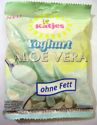 緑の楕円形が多分かぼちゃで、赤い丸がトマトでしょう。 柔らかさは普通のグミ。にんじんやトマトは、ちょっとざらっとした繊維質の口当たりが野菜たっぷりジュースに似ています。 味は、もっさりしている感じで、もっしゅさんが言われていたような"うまからず、まずからず"いうのがまさにピッタリ。 でも味の主張が弱いので、多めに食べても口に残らない感じが良いです。期待してなかったからなのか、個人的にはかなり高ポイントでした。 そして、もうひとつのヘルシー系新作は、アロエ入りのヨーグルトグミ。 パール系パステルカラーを使ったパッケージは、ドルチェ・グミ、シンデレラグミの流れ。 キャッチコピーは『体と心のための官能的な楽しみ』。うーん、あきらかにこれは大人を購買層にしていますね。 さて、中身の方はというと、なんとアロエの葉をかたどったもの。とげとげがあまり再現されてなくて、どちらかというと葉っぱっぽいですが、頑張っています。 katjesは、HARIBOの熊に対して、細みの猫をキャラクターにし、独自のスタイルを打ち出している会社。グミ本体の形も凝るんですね。 色も和菓子を彷佛とさせる渋い抹茶色とくりーむ色。 これは!と期待して食べてみたんですが、味は・・他のヨーグルトグミとほとんど変わらなかったです。 他のヨーグルトグミはフルーツの味がするけれど、これは純粋なヨーグルト味かなってくらいで。 でもまあアロエは本体自体は苦いので、味がしないのもしょうがないでしょう。アロエヨーグルトって普通ヨーグルトの味しかしませんもんね。 さて私の今回のヘルシーグミの評価ですが、以下のようになりました。 |