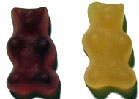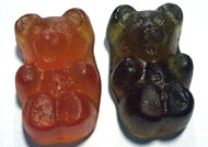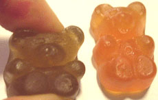 アレルギーの人がいるとかかもしれませんね。 さて、私が今まで食べた事のある、ほとんどのノン・ゼラチンタイプのグミが、異常に固い! その固さは、HARIBOと日本のグミを比べたような、ピンセットでは説明がつきません。 ピンセットでつまんでどんなに力を入れても、びくともしないんですよ! その固さを見るために、ビデオテープや、辞書等を載せて、それを支えられるか、を実験してみました。 辞書は、グミが小さいのでうまく支えられませんでしたが、形はそれほど歪みませんでした。 ビデオテープは、大きさも、重さもちょうどよく、きっちり支えてくれました。 100人乗っても壊れない・・とはいきませんが、この固さはかなりのモノです。 比べて、ペクチン配合の方は、本当にふわふわーっとした柔らかさ。 弾力はありますが、指でぐにゅっと押すと、半分くらいになり、その後ゆっくり時間をかけて元の形に戻る感じ。 |