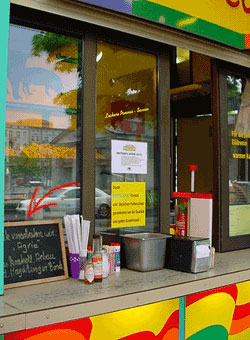 | さてこの芋スタンドのある広場の周りには、なんと4つのソーセージ&フライドポテト(ポメス)の店が立っています。昼時ともなれば、どのスタンドにも人が集まってにぎわっています。 どのスタンドも肉は品質の良いものを使い、それぞれに美味しいのですが、そのなかでもお薦めなのが、Fritz & co. というスタンド。 ここでは使っている芋を店の前の看板に明記し、朝早くからその日の分だけ芋の皮を向き、切って、毎日全部とりかえる油でもって下揚げをしてお客さんを待っています。2度揚げされたポテトはからっとして他の店のような脂っこさがなく、とても食べやすいのです。 また、ソースも普通のお店にはないような種類のものがそろえられ、他の店とはちょっと違うこだわりっぷりをアピール。ちなみにソースは、普通の店にもあるマヨ、ケチャップの他、激辛チリソース、ピーナッツソース、中華トウガラシソース、自家製のニンニクマヨネーズ、ビネガーがあります。人気はチリとピーナッツソースとか。試してみると案外あう!ビネガーは私はグッドアイディアだと思ったのですが、たまにくるイギリス人のお客さんが懐かしがって注文するほかはほとんどでないとか。美味しい組み合わせだと思うんですけれど・・・これで魚があれば言う事なし・・ってそうなると、イギリス名物、フィッシュ&チップスになってしまいますね。 店がポテトにこだわる今の形になったのは5年前だと言います。その前はドネル・ケバブも入れた屋台だったそうですが、品質にこだわり、味にこだわりしているうちにこうなったのだとか。 使っている芋はAgria という揚げには最高の品種。 値段が少々他の店より高いこともあり(ソース込みで 2.5 Euro)高級感のあるこの店。味もそれに恥じない美味しさですが・・・・店主さんは美味しいからこれを毎日食べているの?と聞くと、『もう食べて無いよ!僕もそろそろスタイルに気を使わなきゃならないからね!』とのお答え。そう、美味しいからといって食べ過ぎには御用心。フライドポテトはとってもカロリーが高いのでした。 |  |
