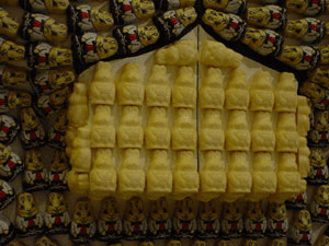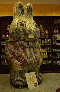 さてこのウサギ。小さなウサギ型のチョコレートをびっしりくっつけて作った巨大なウサギです。なんと3m20cmもの大きさ。なかなかこっていて、様々な包み紙の色のウサギを組み合わせて、左写真のような蝶ネクタイのウサギを作り、歯と目の部分は包み紙をむいて白黒にしています。