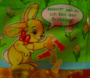 パッケージを裏返すとこのウサギ(あまり可愛く無い・・・)が『つまんでみて!ぼくが春だよ!』と言っています。そこまでいうなら味を変えたら・・・と思うのは私だけでは無いでしょう。日本ではけっこう季節限定の味というのはみかけたように思うのですが、ドイツはあまりないですね。日本は四季があり、旬の食べ物というのが非常に充実しているので、そういう風になるのでしょうか。それともドイツ人はあまり旬の食べ物をお菓子に取り込む、という感覚がないのでしょうか・・・