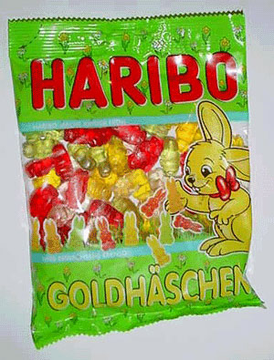 さてはて、お待ちかね(?)イースター限定版のグミです(右写真)。これはおなじみのHARIBOゴールドベアーグミの熊(左写真)が、まんま、うさぎに入れ代わっています。パッケージでも黄色い(金色)熊が赤いリボンのところが、こちらでは黄色いうさぎが赤いリボン。