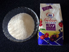 しかし、今回ひとつ気になったのがルバーブの表面をおおう薄皮をどうするか、という事。 サイトで検索したところ、ルバーブの皮を剥く、という説と剥かないでザク切りにするという説がありましたが、 皮を剥くと、せっかくのきれいなピンク色がなくなってしまうので、私は、皮をつけたままにしておきました。 それから、ルバーブの酸味が好きな人はルバーブだけで煮ても良いと思うのですが、もうちょっと甘い方が良い、 という場合はいちご等の赤いベリー系をプラスしたり、 酸っぱいのが好きな人は、酸味のあるセイヨウスグリを入れたりしても良いと思います。 リンゴも良く合いました。 それから、砂糖なのですが、ペクチンやレモン汁等が最初から配合されている、 ゲリアー・ツッカーというジャム用の砂糖がドイツでは発売されています。 これを使うと、砂糖少なめでもとろみがちゃんとつくので、今回はこれを使いました。 パッケージのところに3:1、2:1等のあります。これは、果物対砂糖の比率。今回は3:1を使ってみました。 |