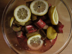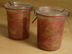 《材料*》 ルバーブ・・・・・・・約700g(手に入るだけ) 砂糖・・・ゲリアー・ツッカー3:1、230g 普通の砂糖なら、果物の重さの約半分〜 甘さ控えめに作るなら少量で小さな瓶に詰めて2週間をメドに食べ切る。ただ、あまり甘さを押さえると、固まらなくなるので注意。 レモン汁・・・・・・・お好みで。私は無農薬のレモンを買って、スライスも入れました。酸味が美味♪ 生姜をおろして入れる、というレシピも。 《作り方》 1:ルバーブを洗い、根元とてっぺんを落とし、ざく切りにする。切る段階でむけてきてしまった薄皮は剥いてしまっても良い。 2:ルバーブをボールに入れ、レモン汁を絞り入れ、砂糖も入れる。砂糖をまぶして数時間置くと、ルバーブからピンク色のきれいな汁が出て来る。(右写真) 3:鍋に入れて強火にかける。沸騰してアクがでてきたら取り除く。中火にして10分程煮詰める。ルバーブの繊維がほろほろと崩れてきたら火をとめる。ゆるくみえても、冷えると固まるので大丈夫。瓶につめて完成! |  |