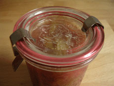瓶詰めはジャムの空き瓶でも何でも良いのですが、私は、WECKの瓶を使いました。 瓶にジャムを詰めたら、瓶と蓋の間にゴムシートを入れて、それをクリップで止めます。瓶より深い鍋にお湯を沸騰させ、 瓶を入れます。この時、瓶をお湯に入れた時に蓋がしっかりお湯の下に沈んでいる事が重要です。5分程煮立てたらお湯を捨て、クリップを外します。 これで、しっかり瓶は密閉され、蓋は押しても引いても開きません。 ゴムシートは円形にちょっと舌の出た形になっていて、この舌部分をひっぱると、空気が入って、パカッとなんなく開きます。 この、今では色々な会社で使われているゴムシートとガラス瓶、それを煮て密閉する原理ですが、 WECKは1900年創業、多分世界でこの原理を考えて商品化した初めての会社(とドイツ人は胸を張っていた・・)らしい・・。 einwecken(瓶詰めにする)という言葉の元にもなっている程、ドイツ人には馴染み深いプロダクト。 |