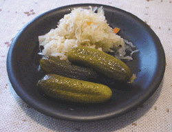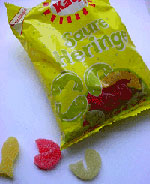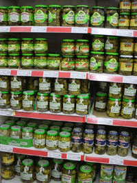 | さて、ドイツの食はグミだけではありません。 普通の食卓に話題を戻しましょう。 ドイツ料理といえば、ソーセージと芋、それに酸っぱいキャベツ“ザワークラウト”を思い浮かべる方が多いのではないのでしょうか? あれは日本では酢漬けキャベツと翻訳されていますが、キムチのような醗酵食品で、酢に漬けているわけではなく、漬け込んで酸っぱく醗酵させているのです。 自分で作っている家もあるのでしょうが、スーパーで缶詰め、瓶詰めも売っています。 そしてたいていそれの隣の棚に様々な種類が並んでいるのが、ピクルス!右写真はなんとすべて様々な種類のピクルスなんですよ!!ロシア風、旧東独の有名ブランドも未だ健在。日本のキュウリよりも短太のものを胡椒、ディル、タマネギ、などと一緒に漬け込んだピクルス、“グルケ”はとっても美味しく、ごってりした肉料理を食べて重くなった胃を酸味で軽やかにしてくれます。 私も大好きで、大きなビン詰めを毎週買い込んでしまいます。グミをむしゃむしゃやるよりは、ヘルシーかと思いまして・・・。 ところで、ドイツ人にも驚かれるほどのグルケ好きの私は先日ハンブルクに行って、狂喜しました!なんとハンブルクには様々なピクルスを樽に入れて1本売りをするスタンドがあるのです!なぜこれがベルリンに存在しないのかは謎です。。。 ベルリンにあったら絶対通うのになあ・・と残念に思いました。しかし普通の瓶詰めより長太めなキュウリを一本買って、ナプキンで包んで立ち食いしている様子はかなりへんな感じもしたのですが、ハンブルクの人達は見慣れている様子。ぼりぼりぽりぽりとかじっている音を聞いていたら口が酸っぱくなり、お腹が減って来てしまいました。 |   |