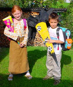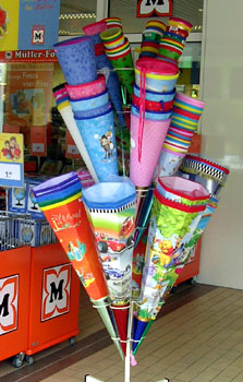 もちろん今は、お菓子が最初から入った詰め合わせセットなんかも売っているので、昔程気合いは入っていないのかもしれませんが。 店で売っているものは、漫画風の絵やファンシーな柄をプリントした物が多いのですが、イマイチ可愛くありません。 無地にリボンを巻いたりした方がよっぽどセンスが良いのに・・と個人的には思っています。 手作りの物は立体的なモチーフをつけたり名前を書いたり、その子どもだけのオリジナルデザインにするため、頑張ったな、という感じが伝わってきます。 祖父母に作ってもらったり、親からの物にプラスしてさらに親戚等からもらっている場合もあるようです。新学期そうそうお菓子三昧! 何にしろ、人生に一度しかない初登校日の、不安と嬉しさが入り交じったような気持ちに、お菓子を学校に持って行ける嬉しさ。 ドイツ人の思い出に根ざす食べ物、パッケージなのでした。 |
