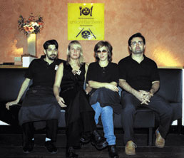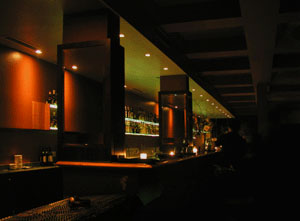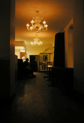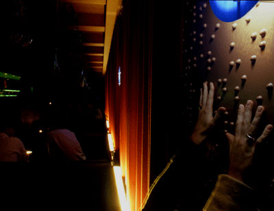 | 待ち合い室でメニューが渡され(レストラン内では真っ暗で読めないので)野菜/魚/ラム/牛肉/アジア風 の五種類の 3〜4皿のコースを選びます。 このメニュー、“子牛肉のフィレ・きのこのホワイトソース”等というものとはまったく違います。例えば魚介メニューの場合 “春らしい装いのヤコブの魚介類” “イタリアの水面で静かな、しかし賢い友だちと待ち合わせ” “大きな火で暖められた肌から、彼はイタリアとフランスの色のコンビネーションを決めた” “全ての食事の後に王様は40人の泥棒がハーモニー溢れる雰囲気を振りまきながらニュージーランド産のフルーツを食べているのを見かけた。” といった感じです。いったい何がでてくるのか?まったく分からない状態で、とりあえずアジア風と、魚料理の3皿のコースメニューを選び、入り口へ。入り口には、盲人、もしくは視角障害者のスタッフ(上写真)がお客を待っています。 まずは『こんにちわ、私の名前はムスタファです。これから私と一緒に暗闇の中に入って、御飯を食べますが、楽しんで下さい。もし、恐くなったり気持ち悪くなったりするようでしたらすぐ呼んで下さい。携帯電話、電気のつく時計等は全てはずして下さい』と注意と自己紹介があります。 そして左手を左肩に置き、(手を取る形でも良いのですが、ここではレストラン内が細い廊下で仕切られていて動きにくいことと、片手が開いていると、人間は不安になりにくいなどの理由から こういった方式が取られています。)レストランに通されます。 |