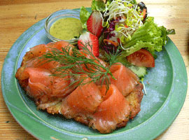 夜はちょっと冷える今くらいの季節には、昼間に行ってお茶、日中は目が開けられないくらいに陽射しがきつくなる夏には生暖かい夜にお食事、というのがココのお勧め時間です。 しかし夏場、夜に予約無しで行こうとするとまったく席はありません。けっこう思いつきで、急に行きたくなる場所なので、いつもわざわざ足を運んでは、席が無い!となり、しょうがなくてその辺の適当なレストランに入る事が多く、実は数える程しかココで御飯を食べた事はありません。最近は昼間に行くように心掛けているので、色々食べ物も試せているのですが・・ お勧め料理はスモークサーモンをのっけたポテトパンケーキ。カリカリっとしたジャガ芋にサーモンの塩気が絶妙にマッチする絶品料理です。日替わりででる魚メニューも美味。 水辺に座ってひなたぼっこをしていると、頭の疲れも取れてきて、明日への活力が湧いてきます!今日も頑張ろう! |