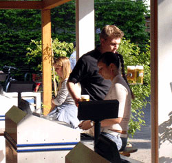 ちなみにここはセルフサービスで、奥にあるスタンドで飲み物、食べ物を注文し、レジで払ってから自分の席に運んで楽しむシステム。ビールは皆半リットルくらいのビールジョッキを持てるだけ指に挟んで持っています。 |