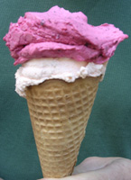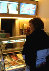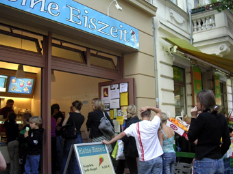 その味を知る人は多いようで、ちょっと暑くなるとこの店の前は大行列。 特に午後は、子連れのお母さん、お父さんで一杯に。子ども達はソフトクリームや、カラフルなチョコスプレーが付いたものがやっぱり好きらしく、 きゃあきゃあ言いながらアイスをほおばっています。 しぶいお父さんが、アイスクリームの上にクリームを絞り出し、飾りをつけたかわいいパフェを食べているとなんだか不思議。 でもドイツ人、特に男の人はパフェとかけっこう注文して、嬉しそうにスプーンを運んでいます。 さっぱり系が好きな私は、クリームやチョコスプレーのついたパフェは苦手なので、シンプルに2種類をワッフルコーンに。 コンビネーションは、酸味と果肉のつぶつぶが美味しいSchwarze Johannisbeeren(黒すぐり、カラント)と絶品ヨーグルト。 ヨーグルトアイスのほとんどが、ちょっと粉っぽい味が気になるんですがここのヨーグルトは軽い酸味としっかりしたヨーグルトの味がするのにさっぱり! 美味しい〜いくらでも食べられてしまう危険な味。ヨーグルトにベリー系が混ざったモノも美味しいです。 それからちょっとほろ苦い大人の味の胡桃と甘過ぎないバナナの組み合せ、マンゴーとレモンのフルーティコンビも・・ ここの店のアイスで美味しく無い、と思ったものはほとんどありません。バニラとラムレーズンは試した事がありませんが・・。 |
