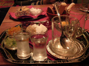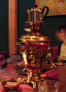 お茶ににはオレンジピール、緑のレモンピール、レーズンのラム酒漬けとクッキー盛り合わせ、 白砂糖、氷砂糖、苺ジャム、柔らかい砂糖の固まりのようなドラジェと、ウォッカが添えられてでてきます。 サモアティーはちょっとほろ苦い感じがするので、砂糖で甘味を添えながら、口が甘ったるくなったら、ウォッカですすいで・・と飲む感じなのでしょうが、 私はウォッカが飲めないので、いつも最後には口が甘ったるくなってしまいます。でも、ついつい甘味をつまんでしまう〜! そしてこの茶房でゆったり過ぎる時間を心ゆくまで味わい、口の筋肉もだるくなり頭も回らなくなって来た頃、急に私を襲う腹痛! 糖分を食べ過ぎるとお腹が膨れて痛くなってしまうんです。 そんなわけで、いつもこの茶房ではロシア式お茶セットは頼むまい、と思うのですが、来るとやっぱり頼んでしまいます。 ベルリンの中の小さなオアシス、タジキスタンでゆっくりしたいから・・