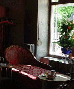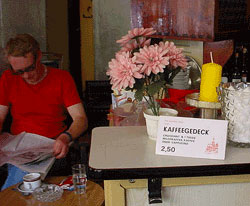 | 私がこのお店に行った時にはちょうど、来週からカフェ内で展示をする予定の編み物アーティストがお店で編み物をしていました。日のあたる一角でコーヒーとタバコをのみながら、ちくちくと編み物をする彼女。 その席に時々、店員さんも座っておしゃべりをするでもなくのんびりしています。(ちなみにここもセルフサービス制) ひっきりなしにお客さんが来るにも関わらず、せわしない空気がまったくないのがココの魅力。 ほこりをかぶった造花を見ながら、のんびりとした時間をゆっくりじっくりと楽しみたい・・・。考え事をしながらお茶を飲んでソファーベットに横になっていたらぽかぽかと日射しも暖かく、ふと、居眠りしてしまいました。 *付足 ヴォーンツィマーのあるヘルムホルツ広場周辺は、最近足が向かなくなりました。 いままでの、ベルリンらしいのんびりした感じがあまり感じられなくなったことが1つ。 なんというか、人ごみ〜という感じが漂っていて、なんだか落ち着かないのです。以前はあったような、いろんな人が歩いている、と言う感じはもうありません。 『乳母車を押しているサングラスの女の人』か『ジーンズをゆるく着こなした若者』がほとんどになってきていて、 よろよろしたおばあちゃんが歩いていると、えっ、と思うくらい、目立ってしまっています。普通に、そこに生きるいろんな人たちがいる、という感じが魅力だったのに・・ 『流行のスポット』になりすぎて、今はちょっと、もう・・という雰囲気になったことが2つめ。 友達と一緒に、どこかお茶しましょうか、という話になってもヴォーンツィマー、はもう名前があがりません。 逆にミッテの北部か、パンコウ周辺の小さなバーやカフェに足が向くようになってきました。 (2007年、5月筆) |