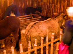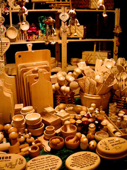 | ここのカフェーからもグリュ−ヴァイン(ホットワイン)の店が毎年でていて、オリジナルのカップがいつもシックで素敵なのですが、今年もこの店を探してうろうろしていたところ、“厩のイエス”ジオラマを発見してしまいました! 夏場にはカフェのテラスとなる、階段を上がった所に藁葺きの小さな小屋があり、その中に山羊、ロバ、ラクダ(と思われる後ろ姿)が・・・!もぞもぞと動く彼等に囲まれた中央に下を向いたマリアの人形があるのですが、マリアの顔が見えないのと、大きさが人間そっくりなので、一瞬、『本物?!』ギョッとしてしまいました。敬虔な気持ちになるというよりはちょっと無気味に思ってしまうのはキリスト教でない私だけ?でも周りの人達も、ちょっと気味悪そうに遠巻きにして見ていました。そして厩の前にはボロをまとった人が立っていて、献金箱をジャラジャラと鳴らしています。うーん、これにお金を入れて、今年のクリスマスに感謝の思いを馳せるのだろうか?と思ったらちょっと不思議な気持ちになったクリスマス市巡りでした。 |