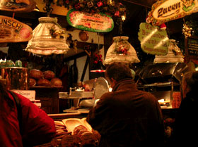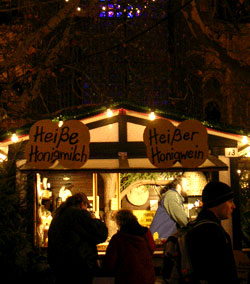 もう一つ気になっているのがハム類をずらりとならべ、注文したお客さんの目の前でスライスして、炒めタマネギといっしょに丸パンに挟んでくれるお店です。 私はあまり肉肉しいのは好きでは無いのでまだためしたことはありませんが、美味しそうです。 この店は蜂蜜ワインの店のすぐそばです。長細い市をゆっくりまわって体が冷えて小腹がすいたら、ワインを飲んでハムサンドを食べる・・そんな楽しみ方がお勧めのクリスマス市です。 |