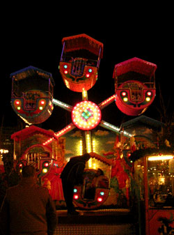 | 出店だけでなく、中央の広場には子ども連れで来る人用に小さなアトラクションも設置されています。メリーゴーラウンド、観覧車、小さなゴーカート。どれも小さめで、スピードはあまりありません。 しかし、冬、すぐとっぷりと暗くなってしまう季節、キラキラと光る観覧車が回っている様子はとてもきれいで、お祭り気分を盛り上げてくれます。 そこら中にはあたためられた甘いお酒、香ばしい焼きソーセージ、クリスマス用のレ−プクーヘンのスパイスの香りが漂い、わくわくしてきます。 クリスマス近く、お世話になった人、友だち、家族へのプレゼントを考えながら、その年の事を思い返したり。 この市のまん中あたりには、ローテンベルクから来たクリスマス用の飾りが大きめの店の中にぎっしりの店があります。木製の伝統的な物が多いですが、プラスチックでできた透明なもの、 鉛板で作った精巧なもの、ラメをまぶしたもの・・・クリスマスツリー飾りから蝋燭をたてると回転する飾り、半円型をした蝋燭たて、お香をたてると煙りを口から吹き出すパイプを口に加えたおもちゃ等々、 ちょっとしたプレゼントにもぴったりです。ただし、この手の店はどのクリスマス市の中心にも大きな店舗で出店していますので、ここでしか手に入らないと言うわけではありません。 |