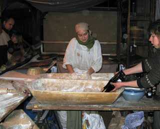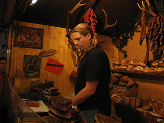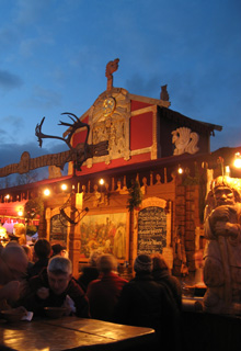 | 学生アルバイトらしき女の子たちが「黒ビールこんなに入れちゃうの。もったいない!飲みたいわ〜!私たち、もうシゴトしたくないのよ〜」と 照れ笑いしながら捏ねていました。 「最高級品」をうたうならば、もっとオオ〜〜〜〜こ、これがクリスマスマーケットに?!と思う程のインパクトが欲しい気もしましたが……。 その辺はお城のイメージでカバーかな?飲み食いして楽しいマーケットというよりは、お城のムードを目で楽しんでロマンチックなお散歩?と言う感じのクリスマスマーケットでした。 | ![]() |